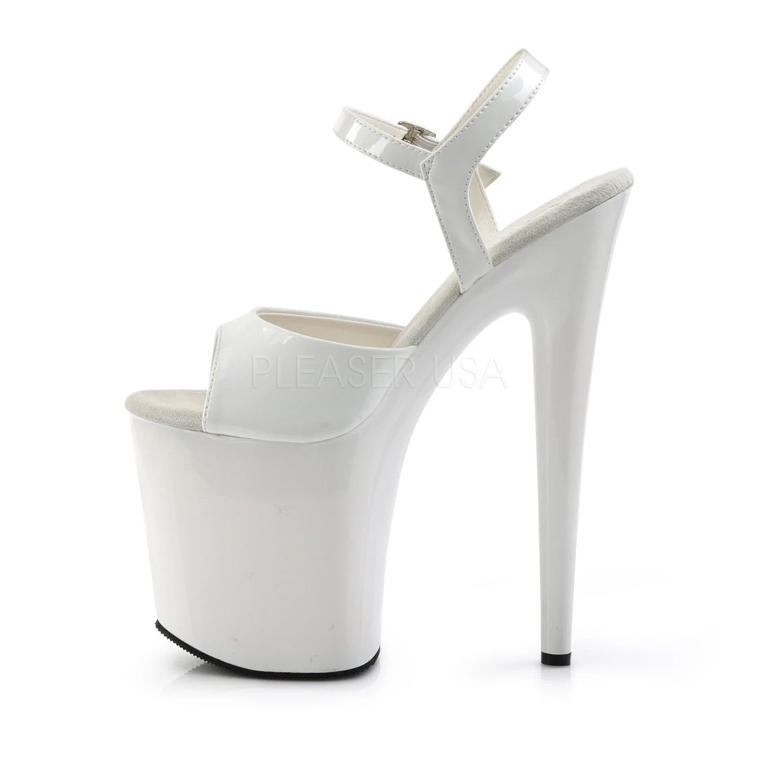 Women’s White 8 inch heel ankle strap exotic dancer shoes featuring 4″ Platform.