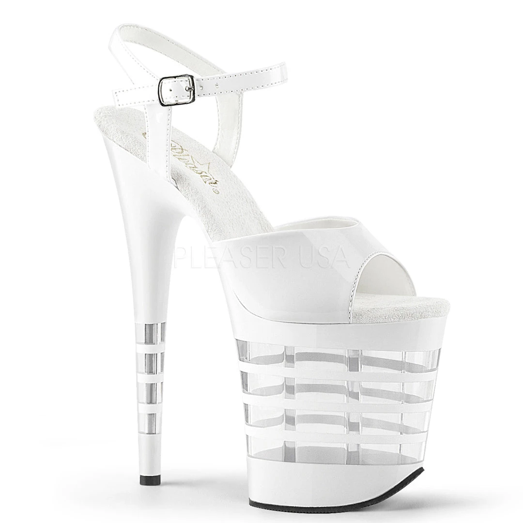 Women’s White 8 inch heel ankle strap stripper pumps with 4″ Platform, to help promote the appearance of longer firm legs and a perky booty.
