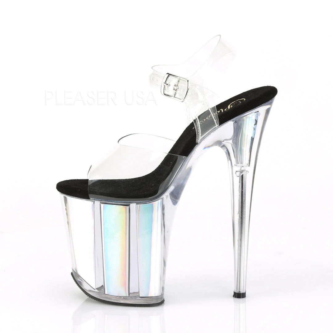 Create the ultimate look with these clear and silver 8 inch stiletto heel ankle strap pole dancing shoes with a 4″ Platform.