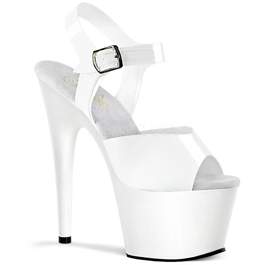 Women’s white ankle strap pole dancing shoes with a 7″ stiletto heel and 2.8″ Platform, to help promote the appearance of longer firm legs and a perky booty.