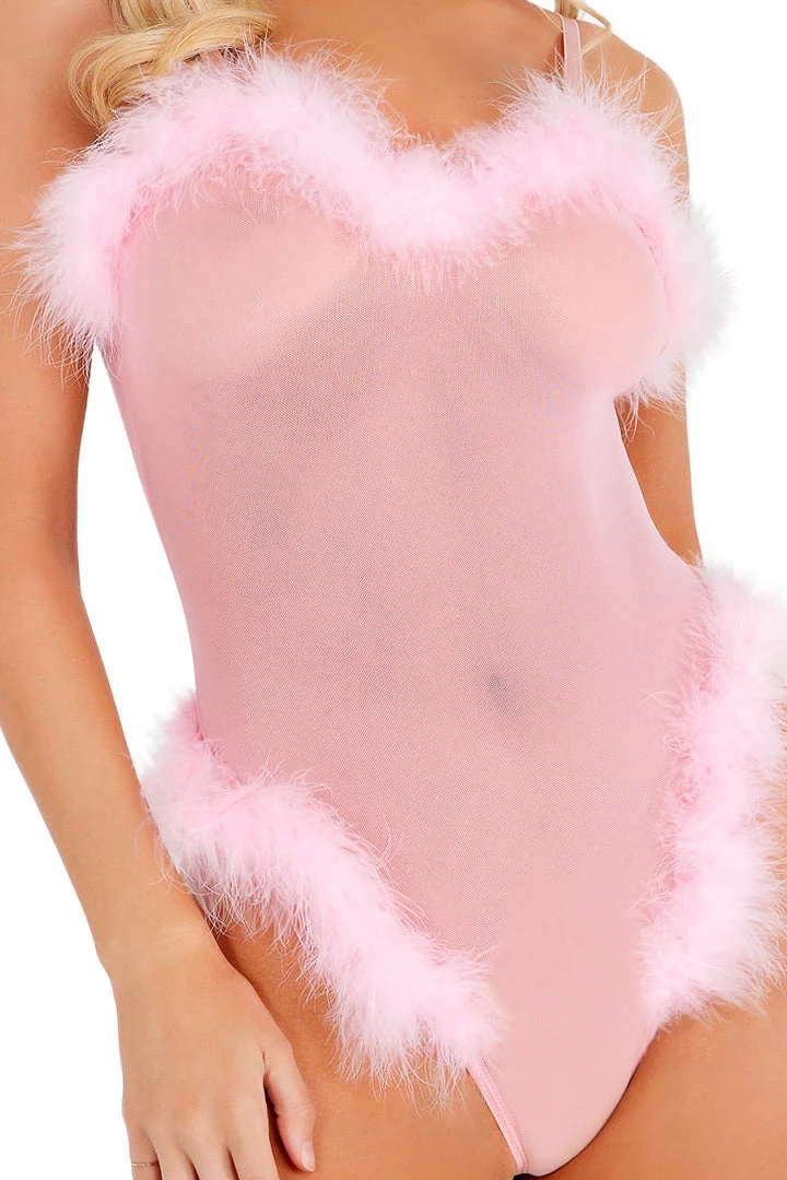 Strike a pose in this boudoir-perfection lingerie that features a Baby Pink Marabou Sheer Teddy. Includes a baby pink sheer teddy with adjustable shoulder straps, marabou feather trim along the bust and sides, and thong cut rear.