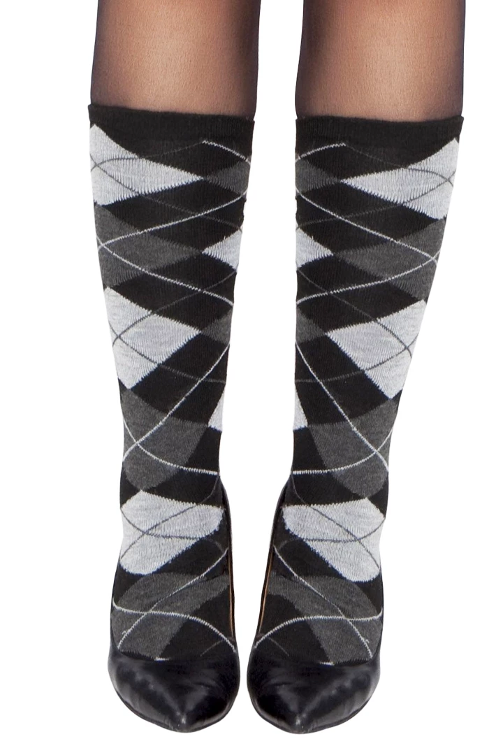 Accessorize that outfit with these and studious grey argyle knee high socks. Features a pair of knee high socks with black and grey argyle pattern.