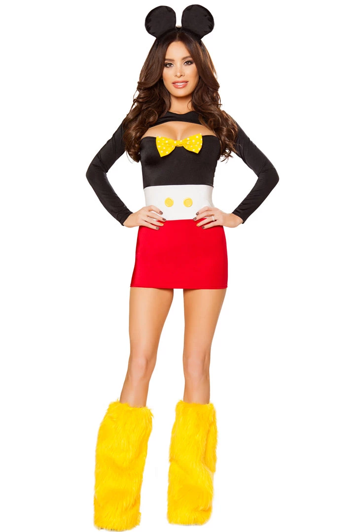 You don’t have to be at the ‘happiest place on earth’ to celebrate the magic of Disney when you wear this Playful Mickey Mouse Costume featuring a Mickey Mouse costume. This 3 piece women’s Mickey Mouse costume features a stretch tube top dress with yellow polka dot bow and yellow buttons. Includes black long sleeve shrug and Mickey mouse ears. *Yellow leg warmers sold separately.