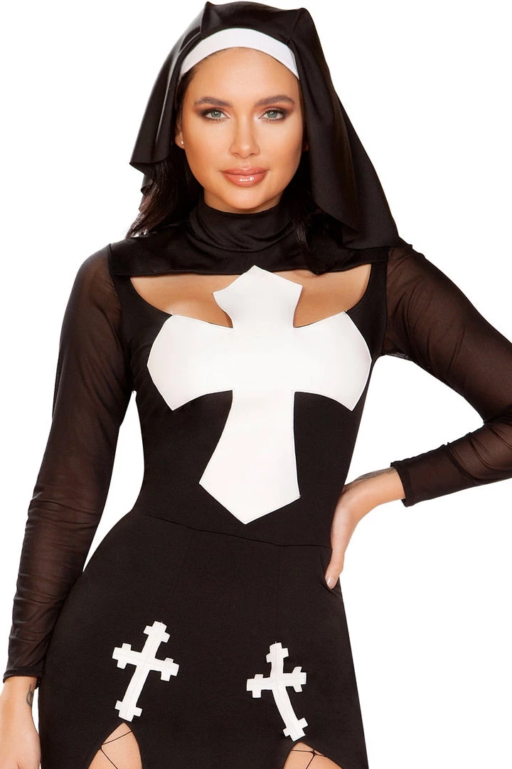 Confess your sins in this Rogue Sister Nun Costume for Halloween! This two piece naughty nun costume includes a long sleeve mini dress with mesh sleeves, open neckline, large white cross, and slit details. Includes a nun habit veil to complete the look! *Hosiery fishnet tights not included.