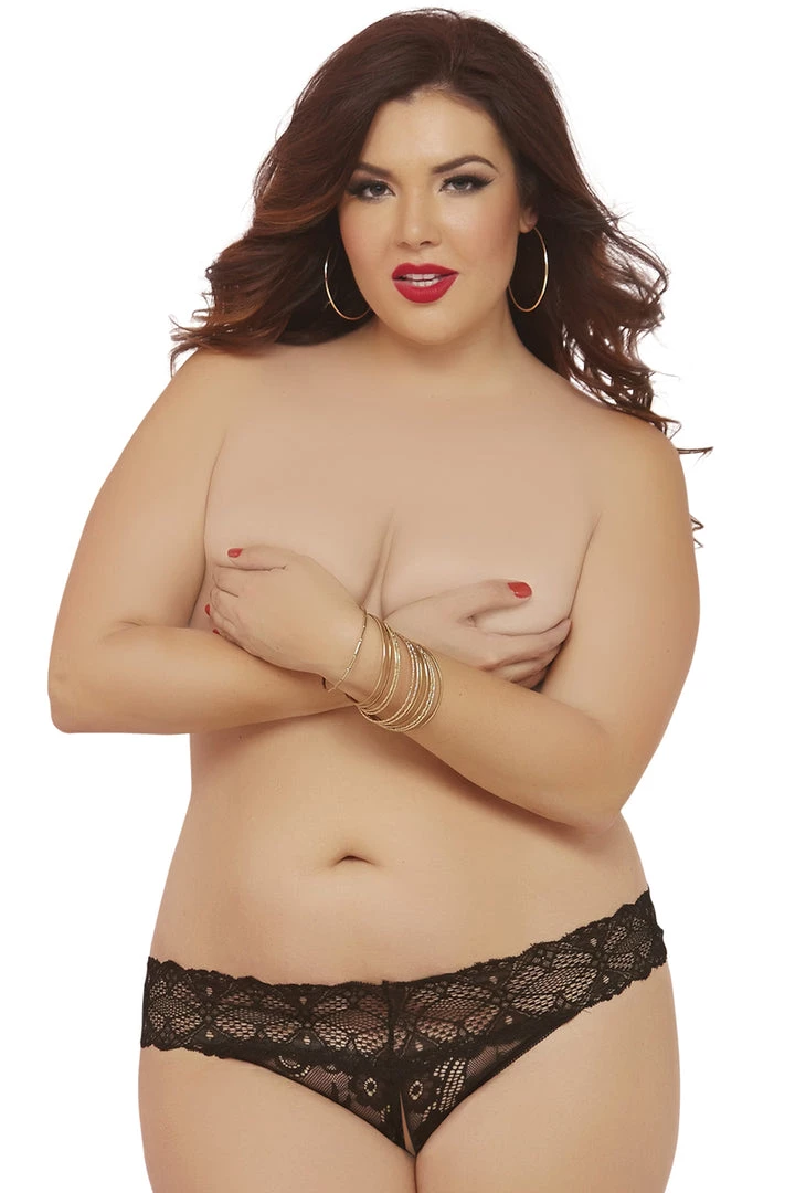 Create a tantalizing surprise in these Black Crochet Lace Split Crotch Thong panties featuring a black crochet lace split crotch thong with thick stretch waistband.