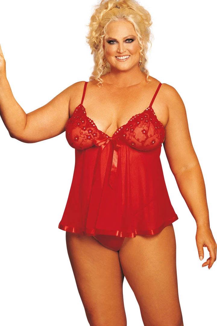 This Red Sequin Embroidered Mesh Babydoll & Panty is equal parts seductive and functional. Attractive embroidered cups with sequin overlay, sheer mesh cups, adjustable shoulder straps, and short flutter mesh babydoll with satin trim. Comes with matching red mesh g string panty.