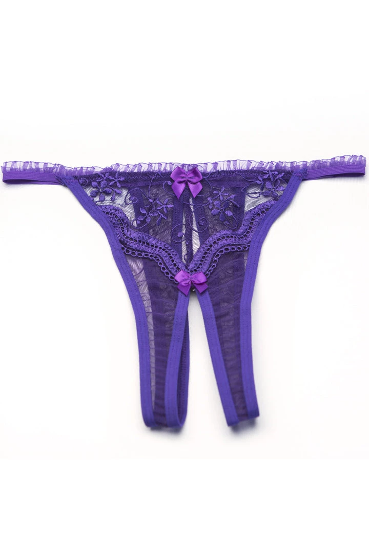 Add a touch of lace with these Purple Scalloped Embroidery Open Front Thong panties that feature stretch elastic ruffle straps, open crotch, and delicate embroidered floral lace detail.