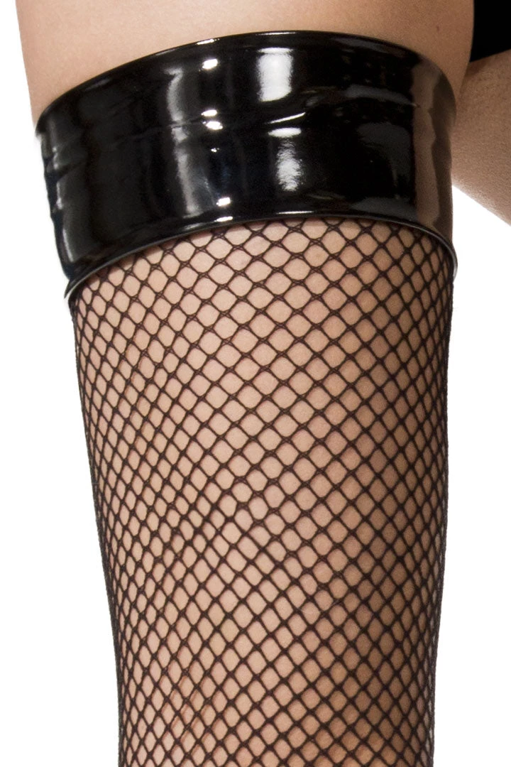 - Includes: Pair of fishnet thigh highs with vinyl tops