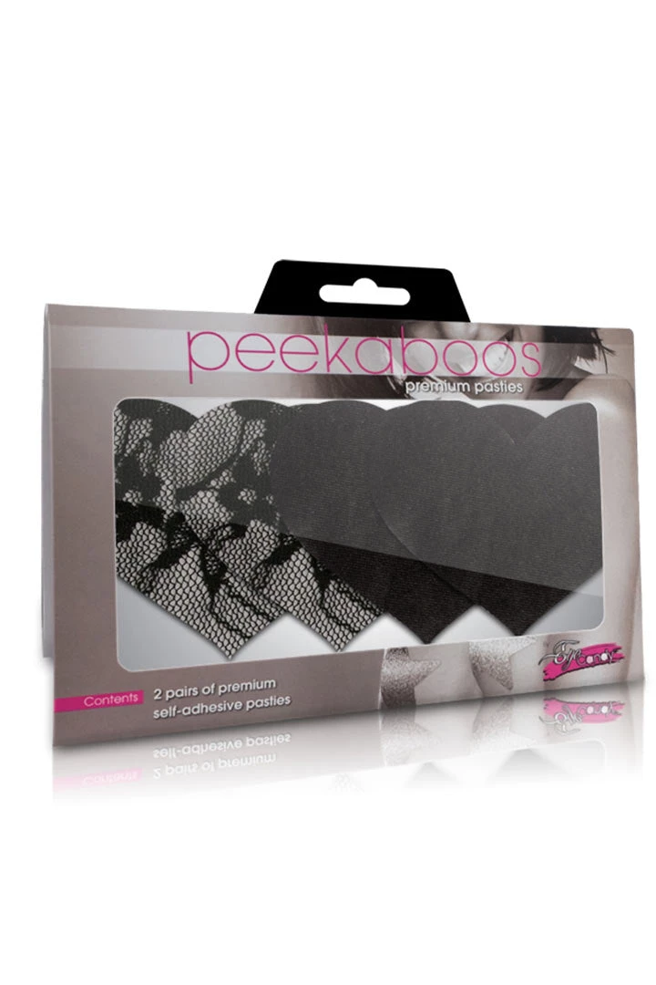 Peekaboos Premium Pasties. Wear more revealing fashions! Cover up with style! Lasts as long as you do. Dance all night without even a slip. Fun as a flirty fashion add-on or just as premium pasties. Contains two pairs of premium self-adhesive pasties. Satin and Lace Hearts’s Gray and Black.